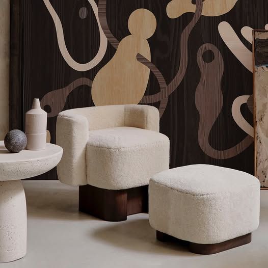 Materials: top in shearling, base in dark-stained Canaletto walnut wood.
