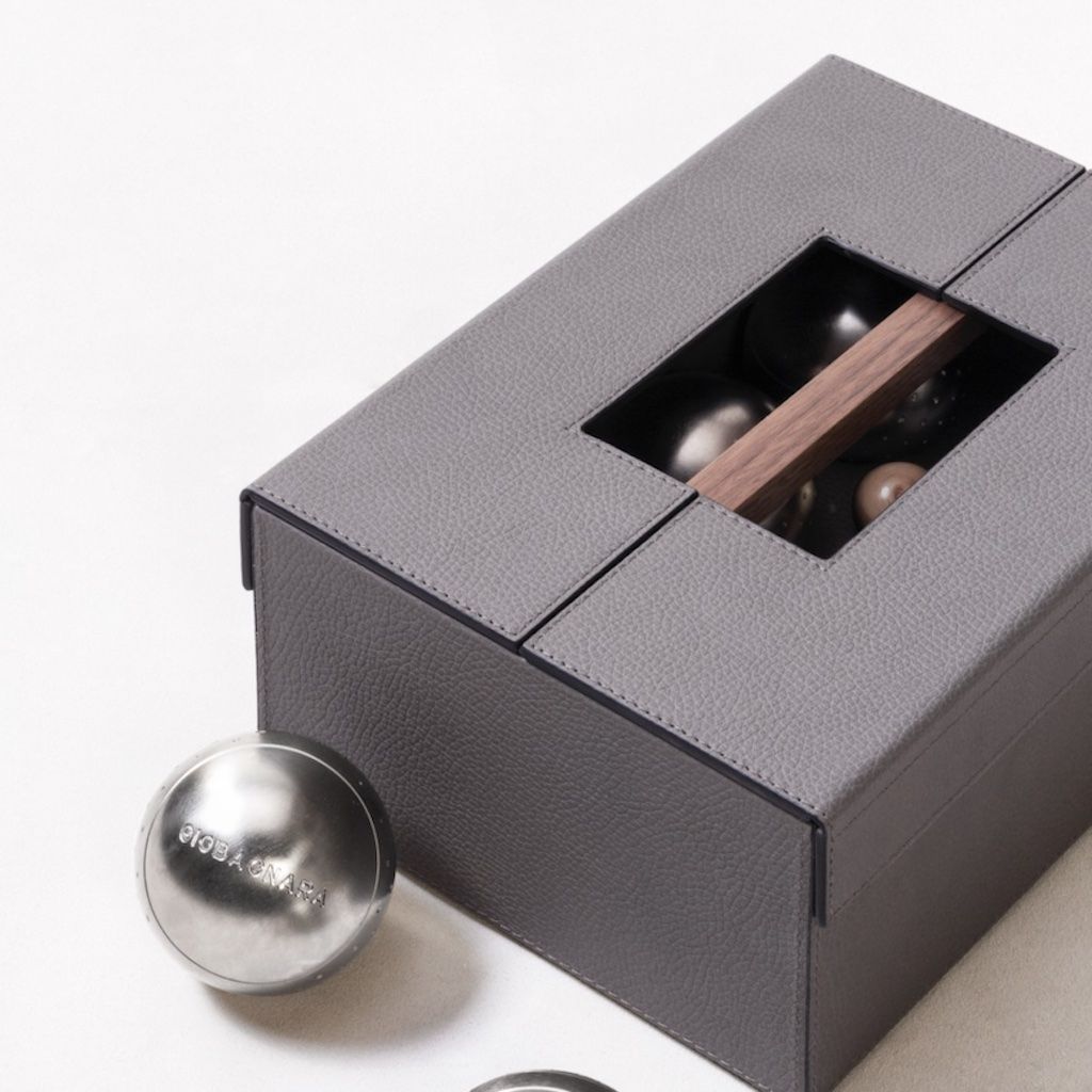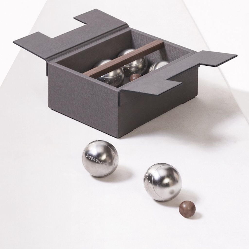 A classic Mediterranean pastime, this pétanque lawn bowling is presented in a precious leather covered wood case with a solid walnut wood handle.