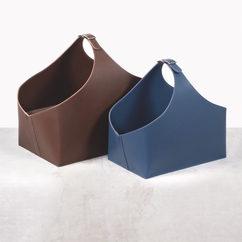 Water resistant saddle leather storage basket with handle and polished chrome buckle.