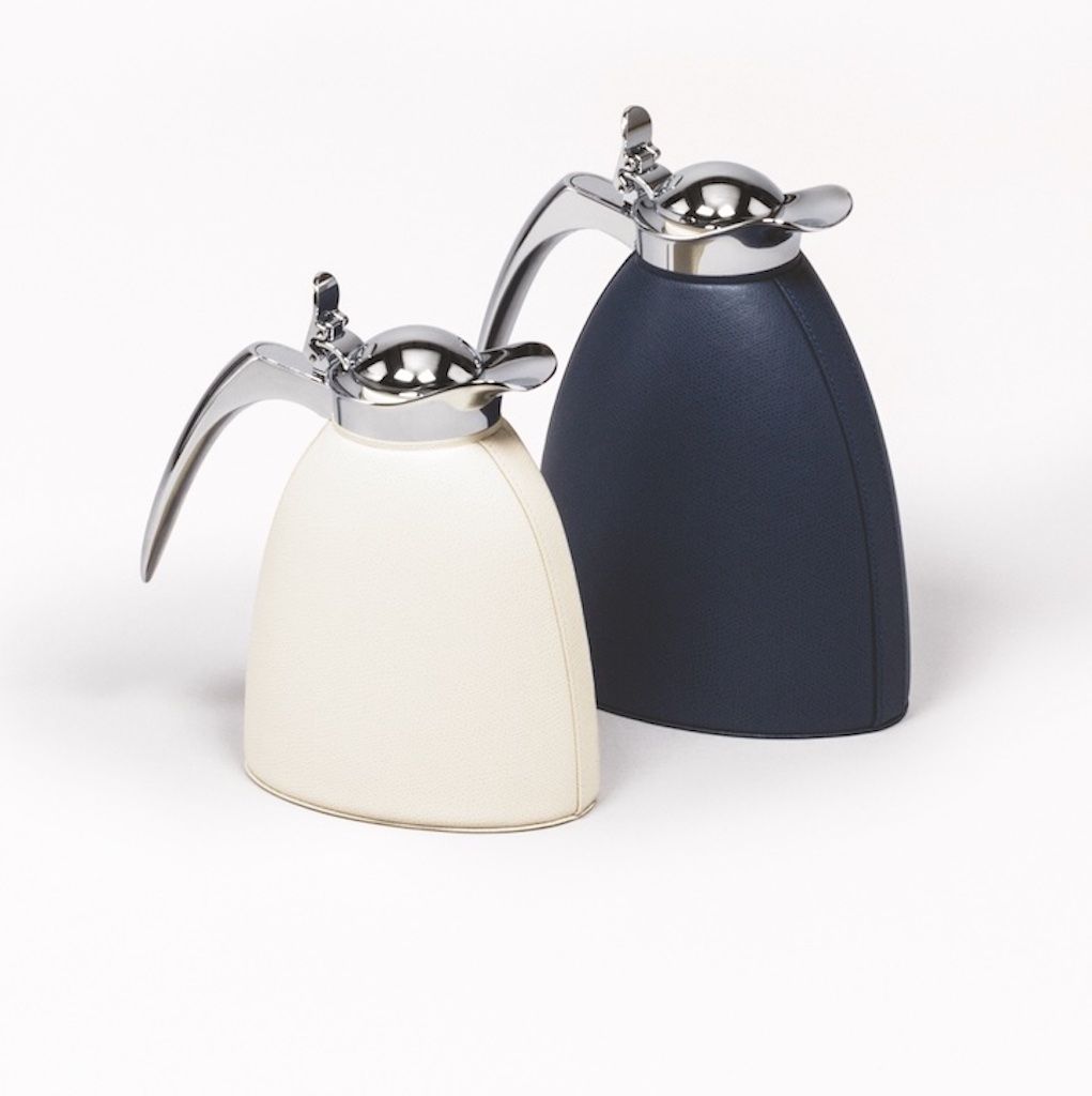 Partially leather covered insulated brass carafes with chrome-plated finish.
