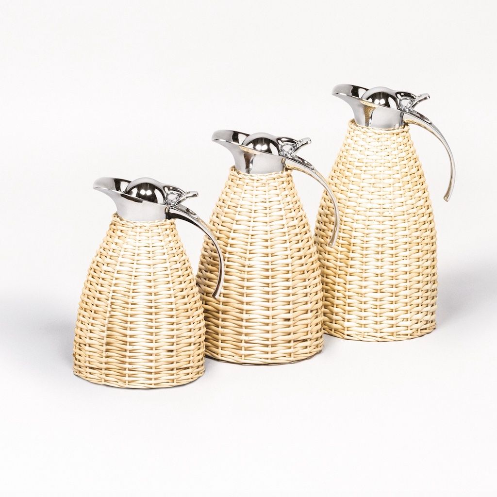 Partially willow covered insulated stainless steel carafes with chrome-plated finish.