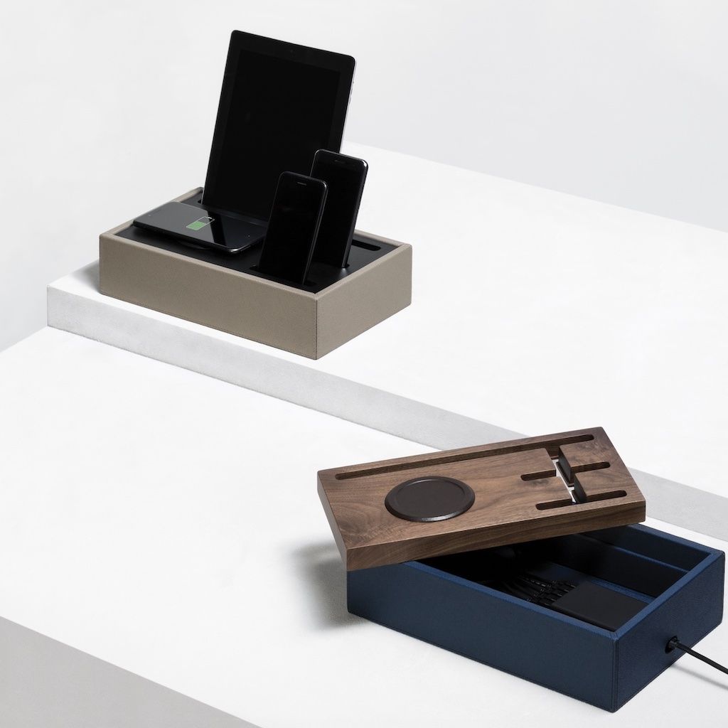 A wireless Certified Qi standard charger, adopted by the largest mobile devices manufacturers, in integrated on the wooden top and dressed up in leather to march the color of the wood.