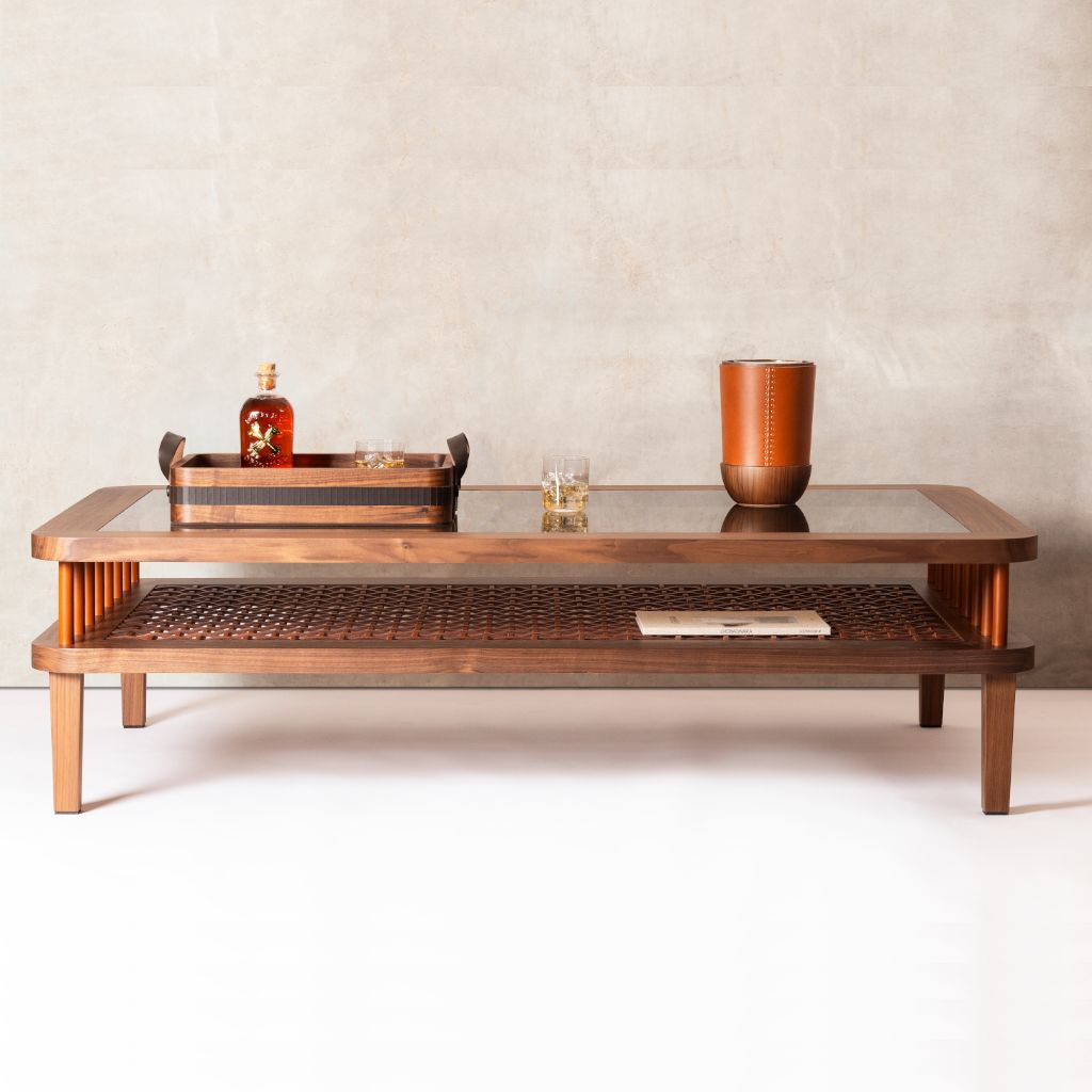 Between classic elegance and modern restraint, the Toiles de Noyer coffee table pairs a walnut wood structure with a lower level in handwoven saddle leather, where the intricate weave lends depth, texture, and artisanal richness. Above, held by slender saddle leather pillars, a tempered glass top, available in a bronze-colour
