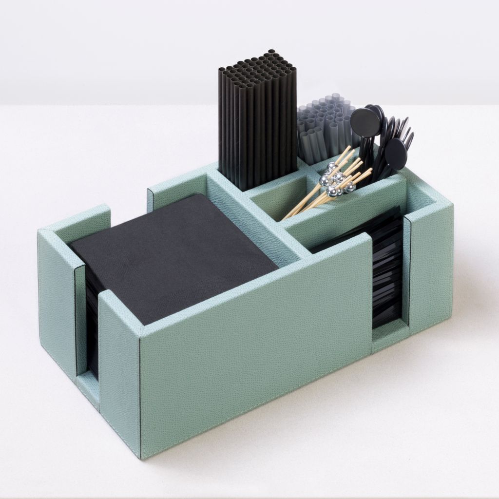 The larger one, accessible from two sides, fits cocktail napkins (12,5 x 12,5 cm), while the other five are perfect to host straws, picks, stirrers and other accessories.