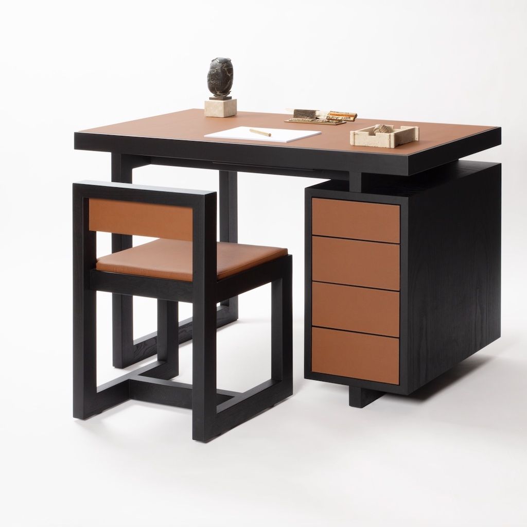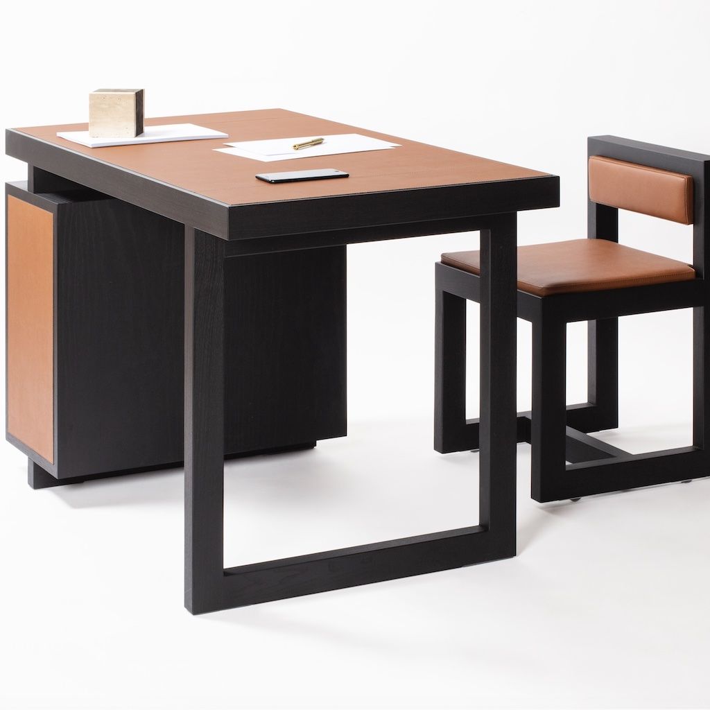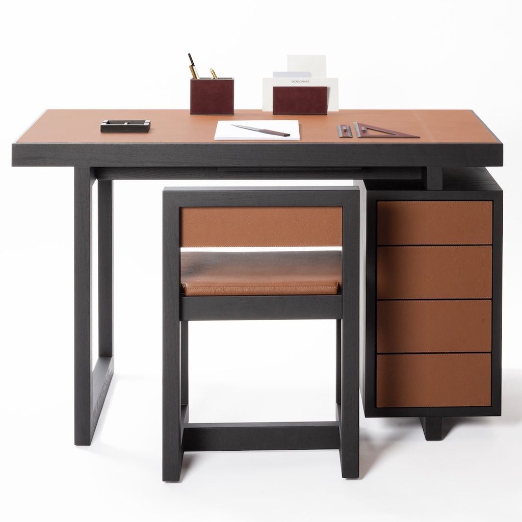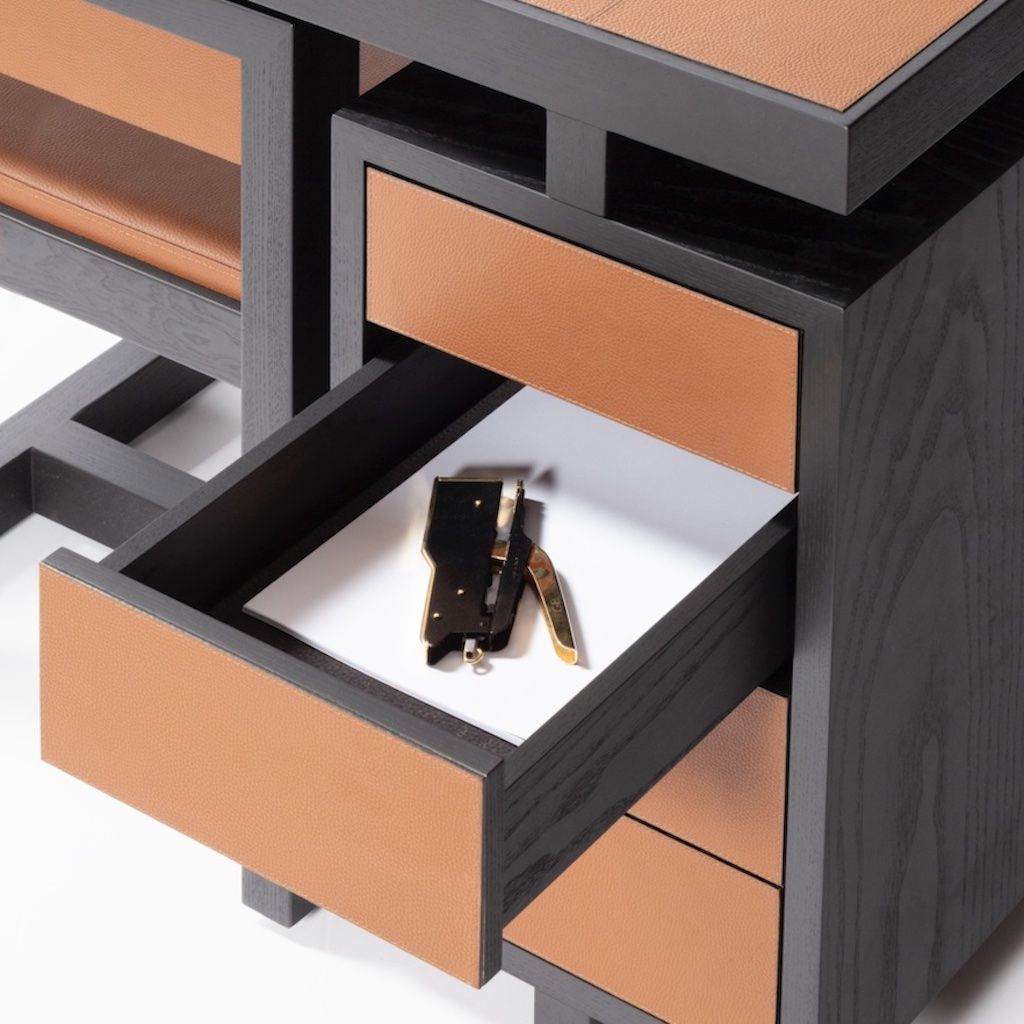 The desk features push-pull capacious drawers customizable with dividers on request.