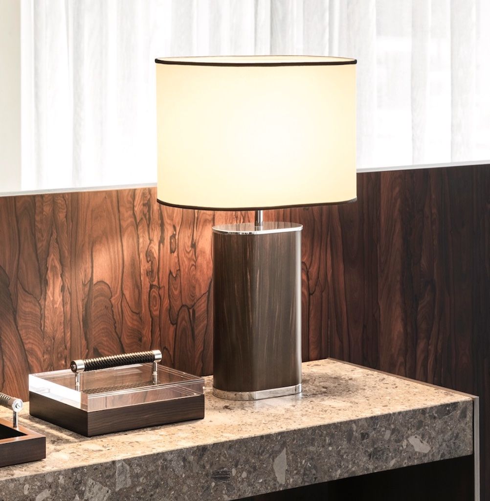 Oval lamp featuring an ebony structure. Chrome or gold metal base and details, oval shade.