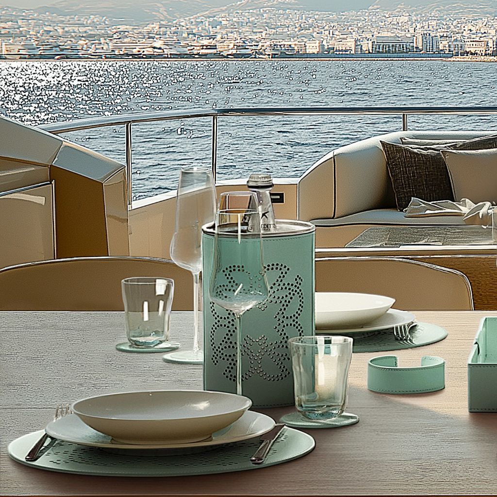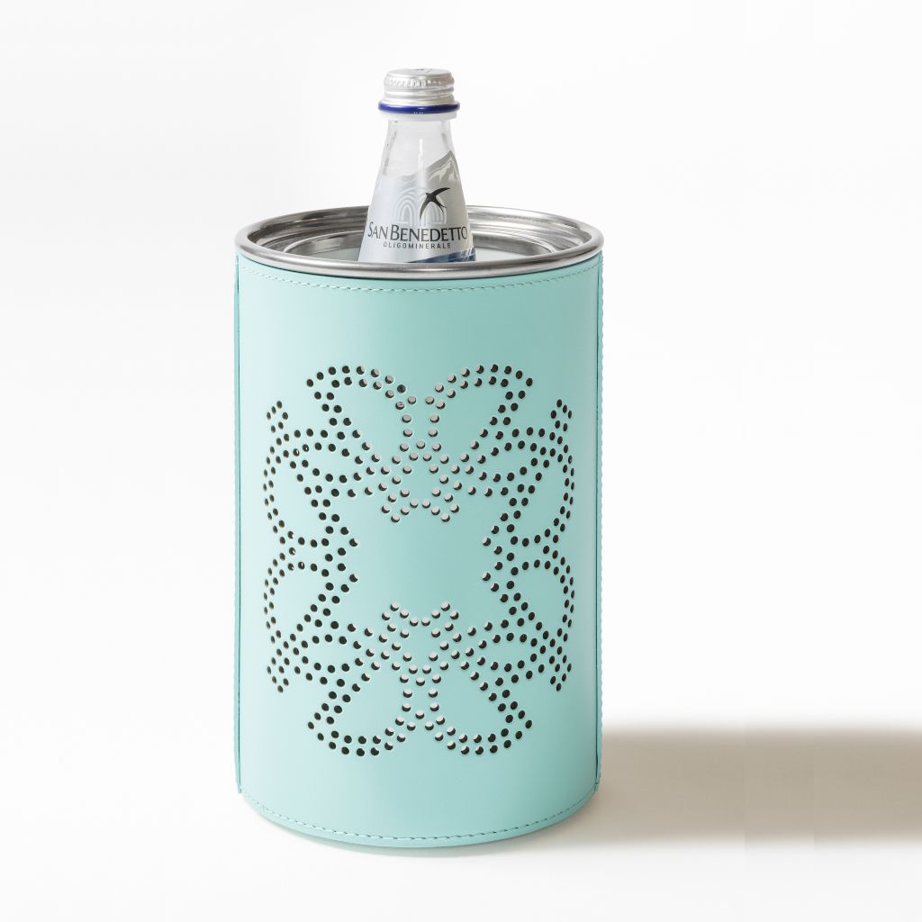 Stainless steel thermic bottle cooler covered with water-resistant and UV-resistant finish, featuring a perforated ELIE SAAB Monogram
