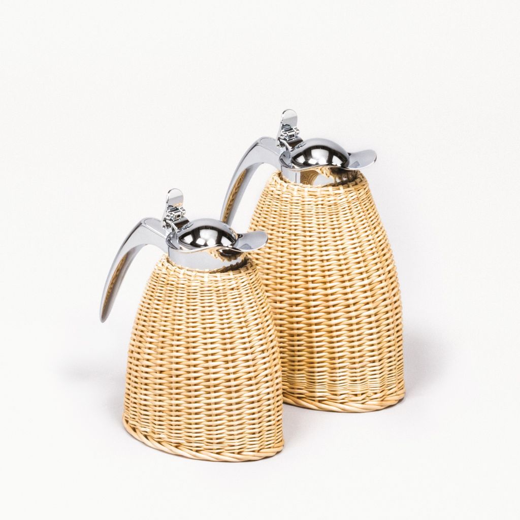 Insulated brass carafe with chrome-plated finish partially covered with fine willow.