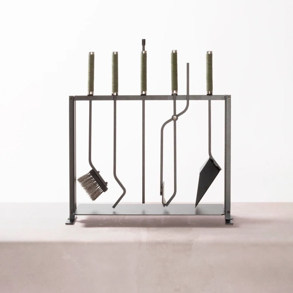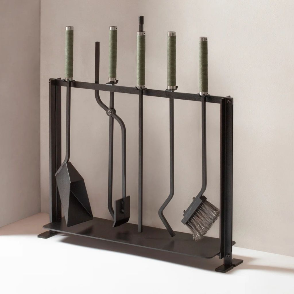 The set is equipped with a fireplace brush, a fire poker, a blow poke, fireplace tongs and a coal shovel.