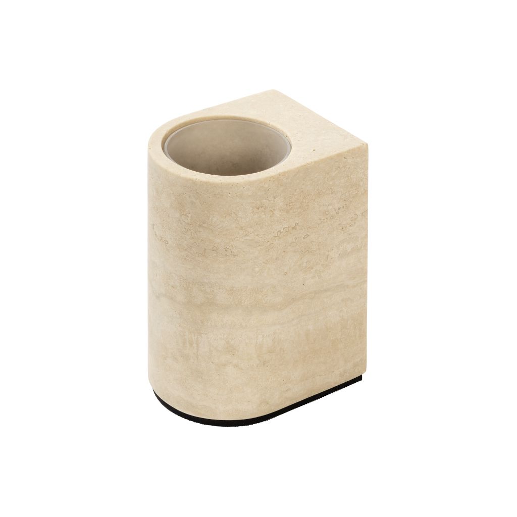 Defined by single, sculptural volumes and pure, graphic silhouettes, the pieces of the Nobble bathroom set embody the meeting of timeless aesthetics and modern sensibility. Travertine surfaces rest on brushed burnished bronze bases and are enriched with matching bronze details, while removable containers ensure practicality without compromising style.