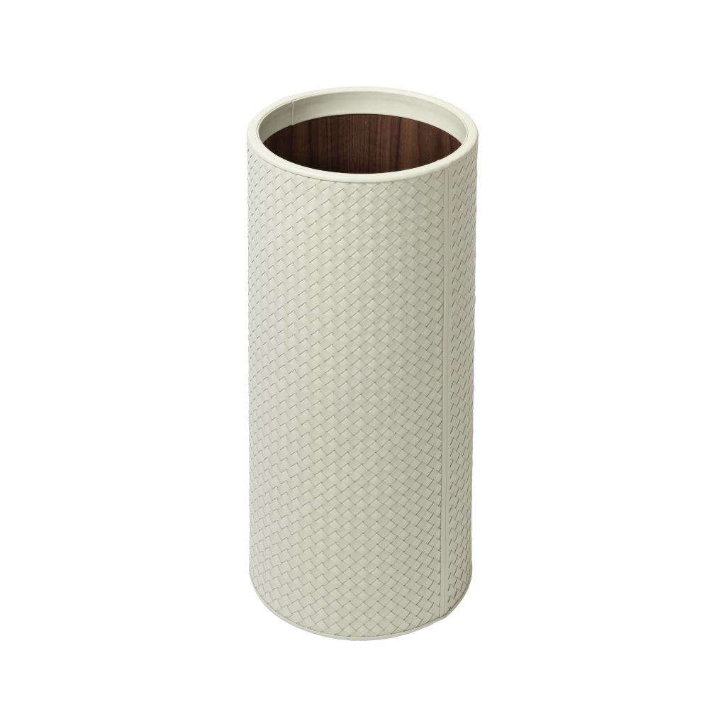 Round waste basket, handwoven leather cover, lining in varnished wood.