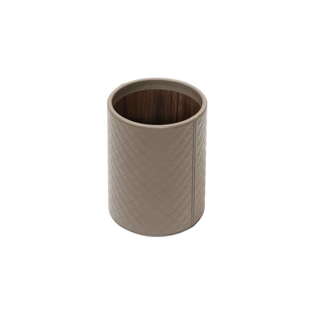 Round waste basket, quilted diamonds padded leather cover, lining in varnished wood.