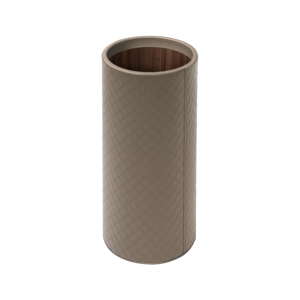 Round waste basket, quilted diamonds padded leather cover, lining in varnished wood.
