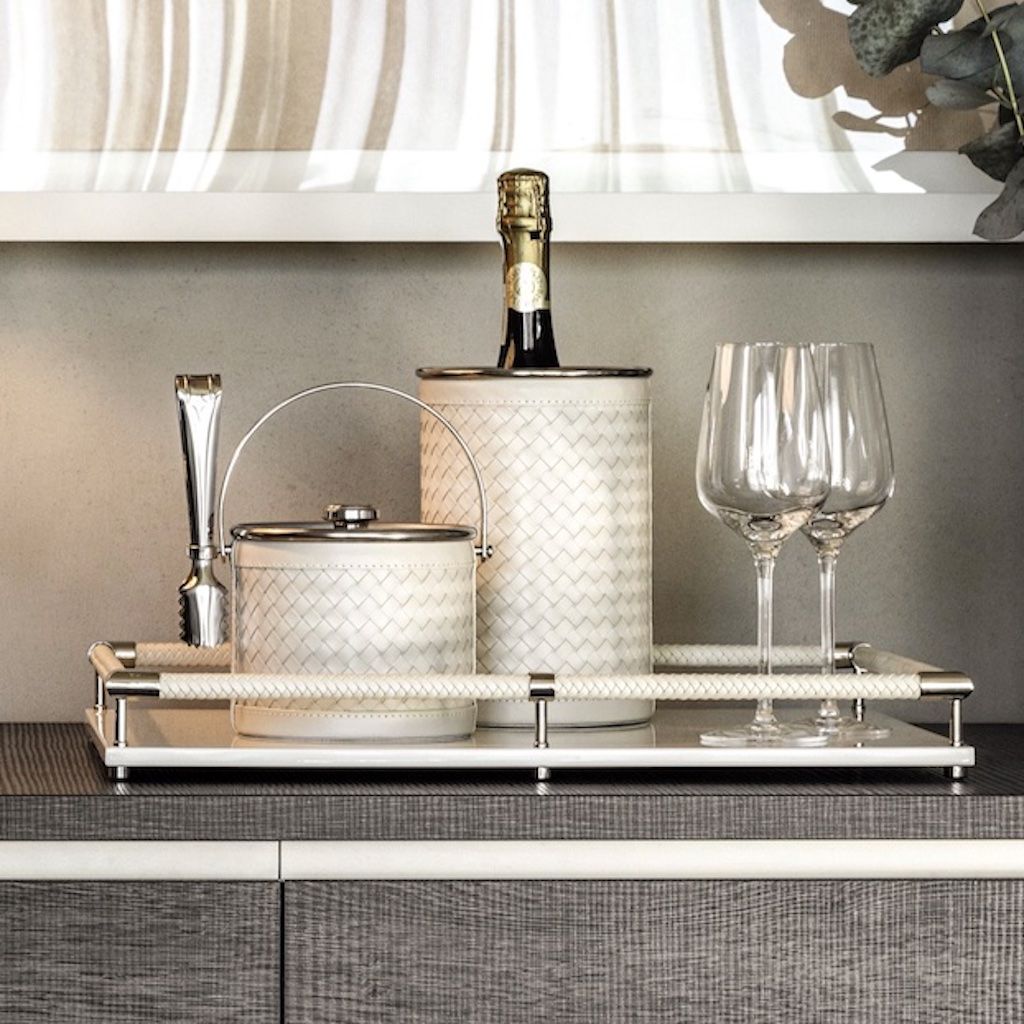 Stainless steel ice bucket covered with handwoven leather.