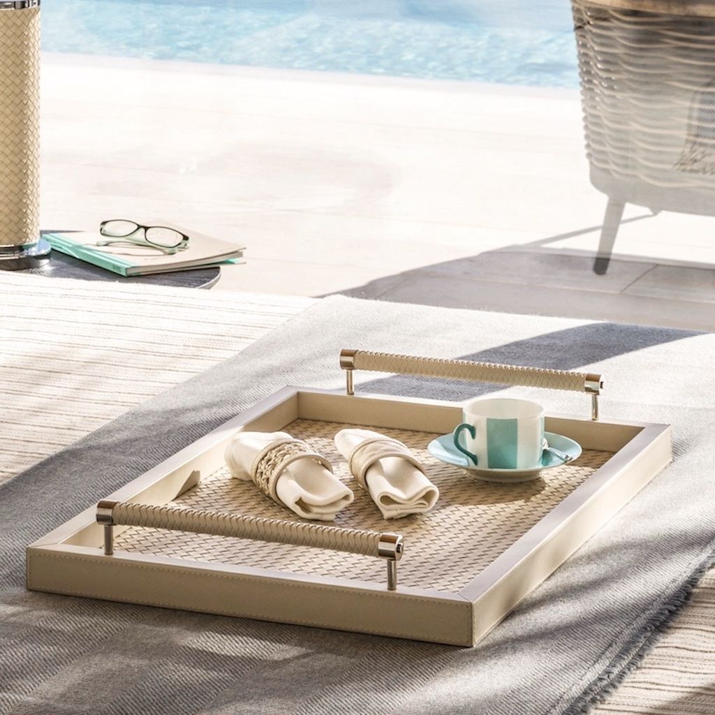 Leather tray with handwoven leather lining, handwoven leather handles.