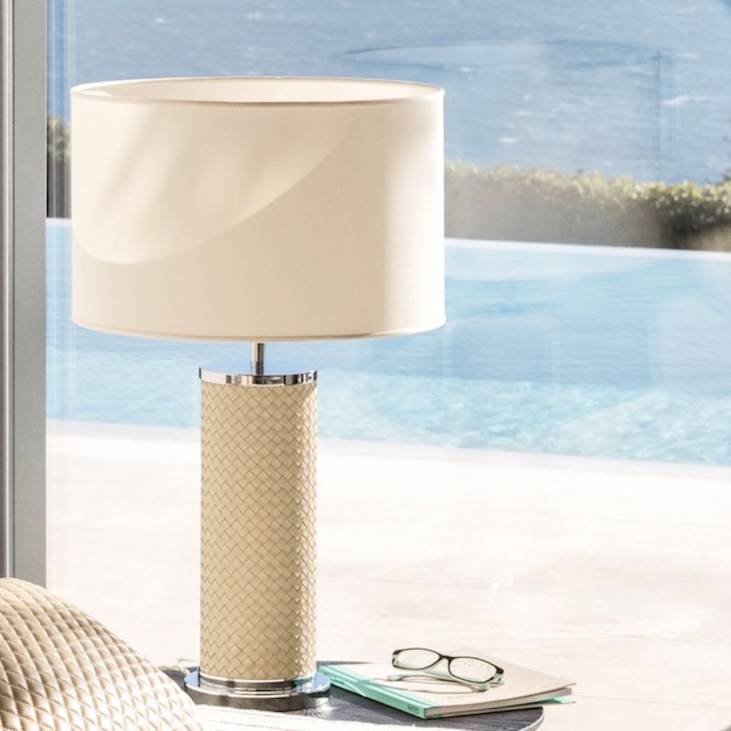 Cylindrical lamp, with chrome or gold metal base, covered with handwoven leather, cylindrical shade.