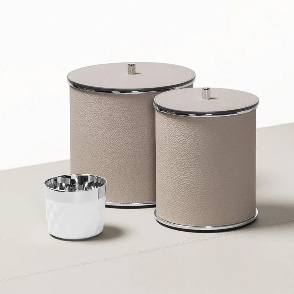 Partially leather covered insulated double chamber brass and stainless steel structure.
