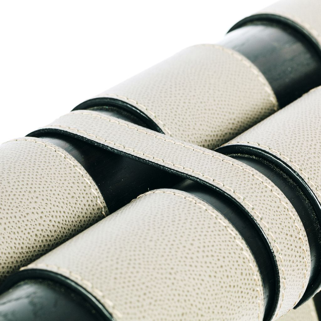 Sturdy oak folding structure in oak with leather stripes as seat.