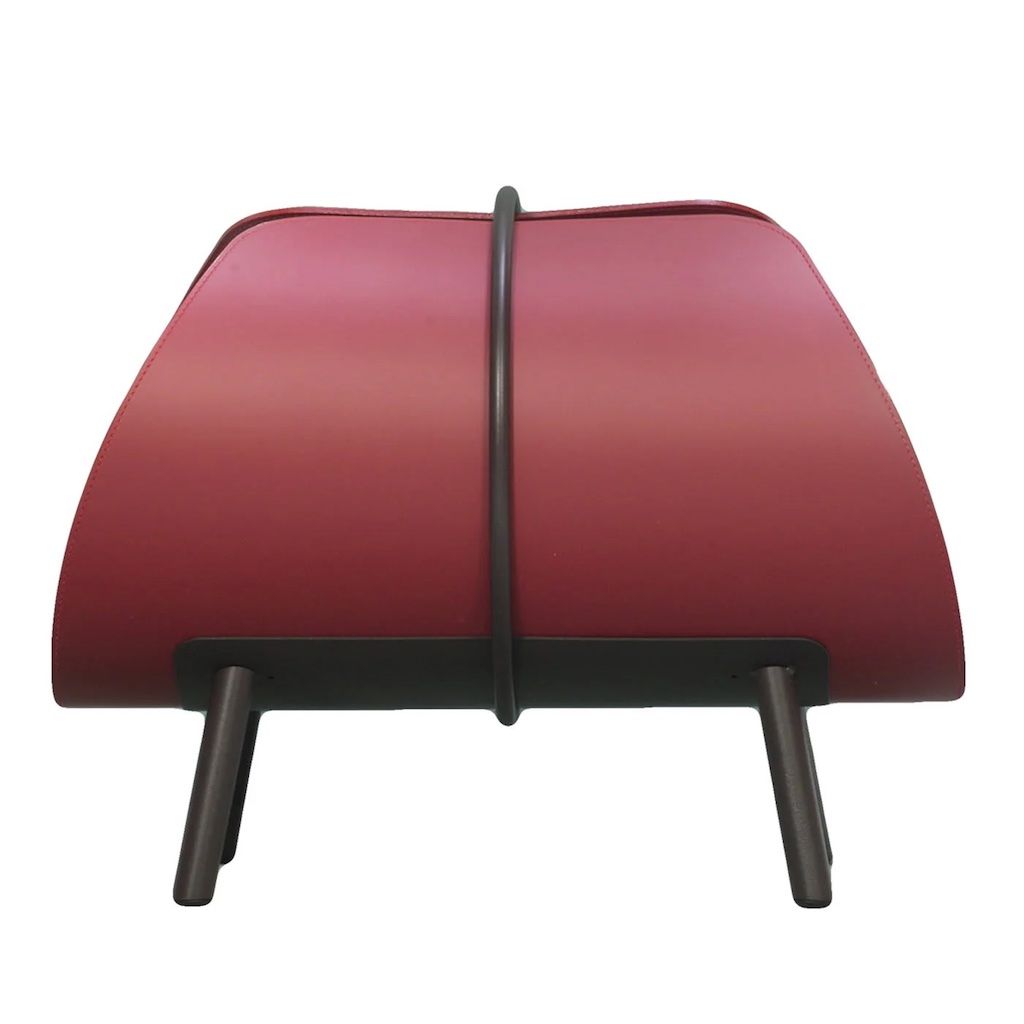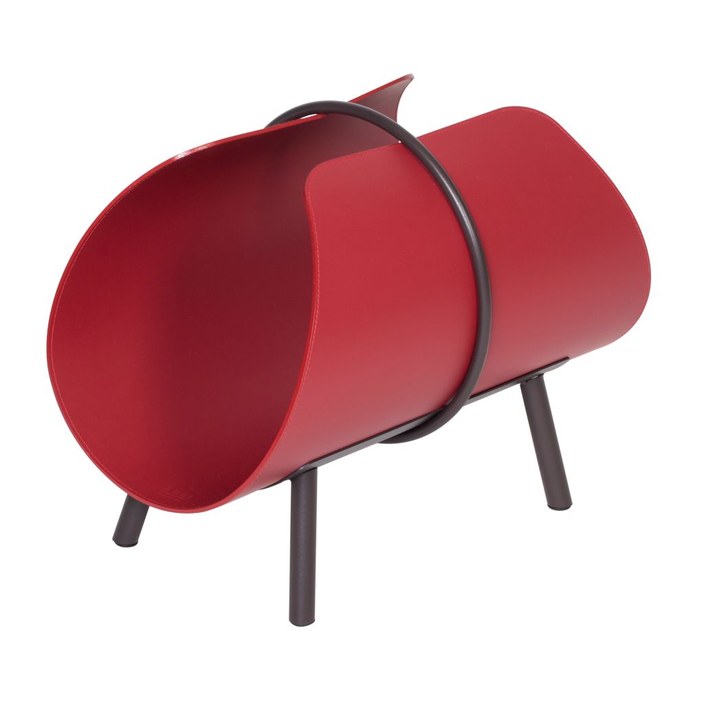 A magazine rack that generates from a single Tecnocuoio sheet, a finest regenerated leather with water-resistant and UV-resistant finish, moulded and wrapped up in a solid metal structure that transforms into an handle.