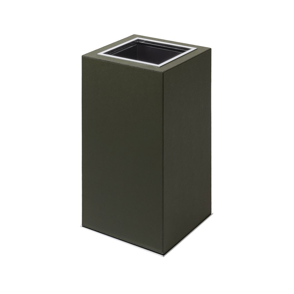 Leather-covered wood structure with metal base and top frames available in three finishes. Equipped with a non-slip waterproof rubber base underneath and a plexiglass inner structure for easy cleaning. The outer structure glides over the inner one, allowing the plastic bag to be secured and discreetly concealed.