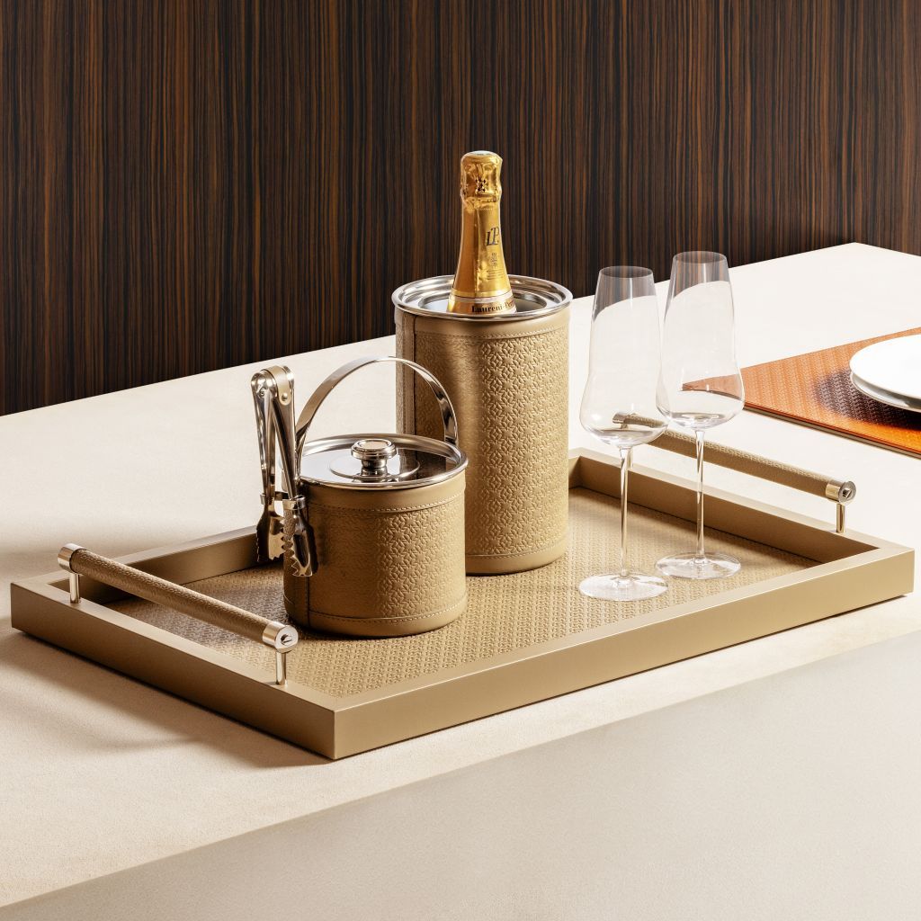 Stainless steel ice bucket covered with leather featuring the ELIE SAAB Monogram pattern ontwo sides.