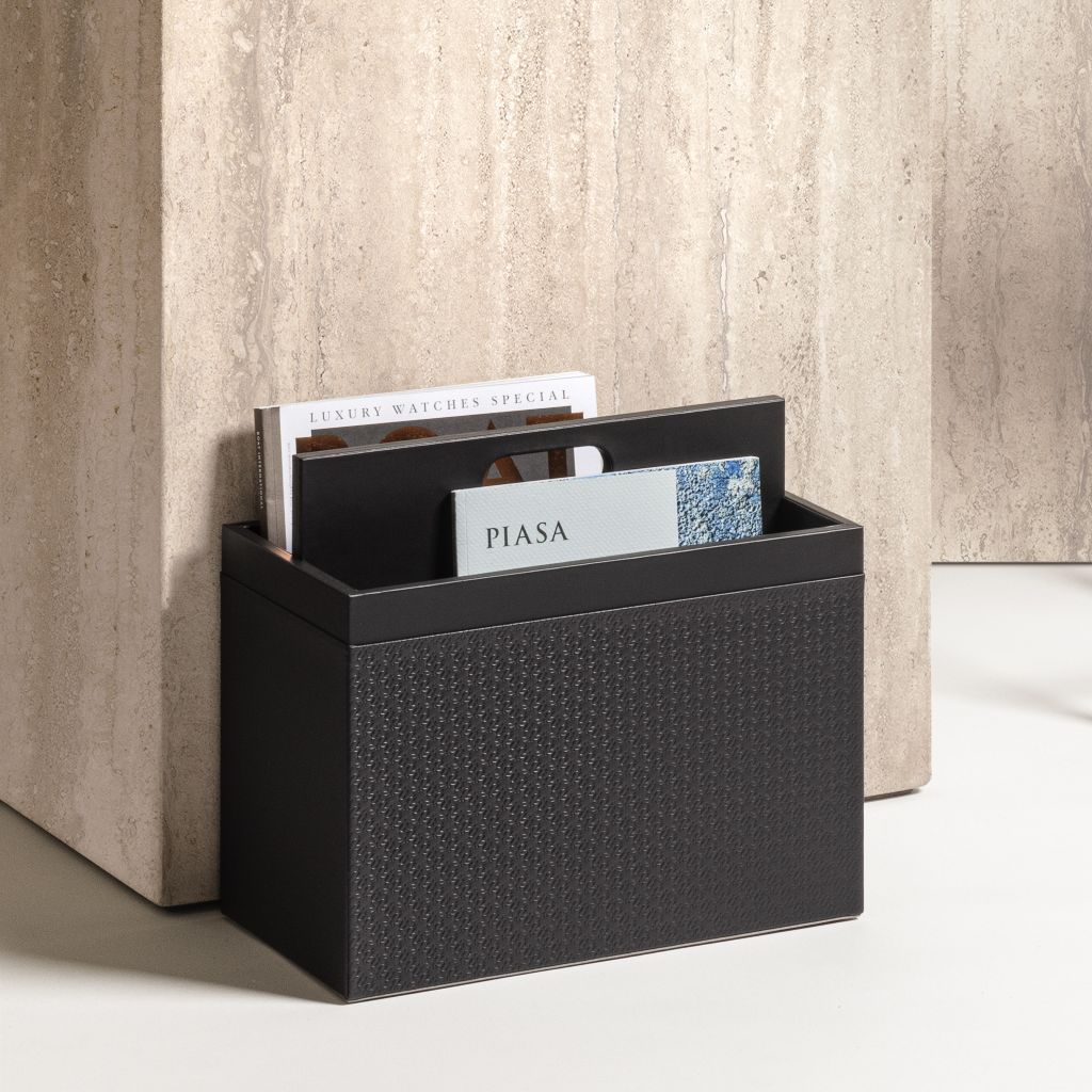 Leather magazine holder featuring the ELIE SAAB Monogram pattern on two sides, lining in varnished wood.
