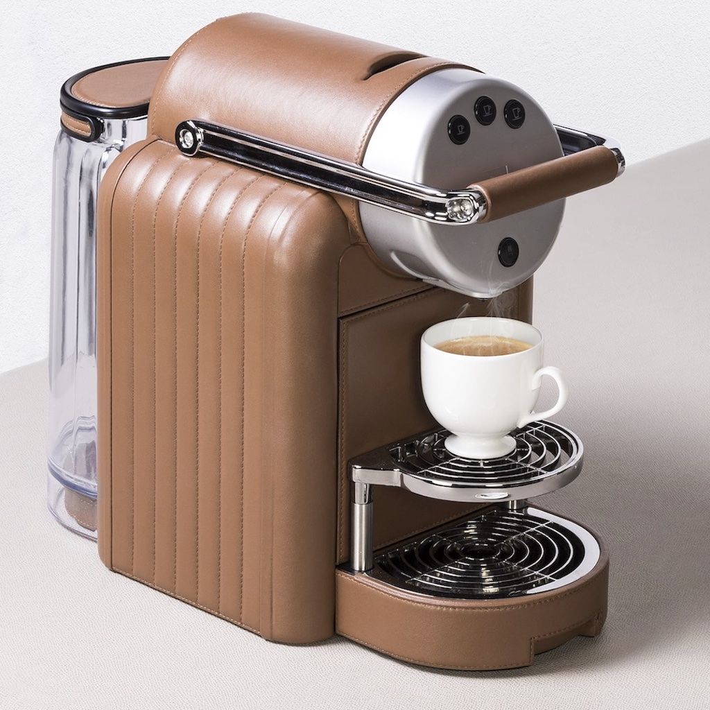 Original Nespresso machine covered in leather with a diamond or straight lines quilt pattern.