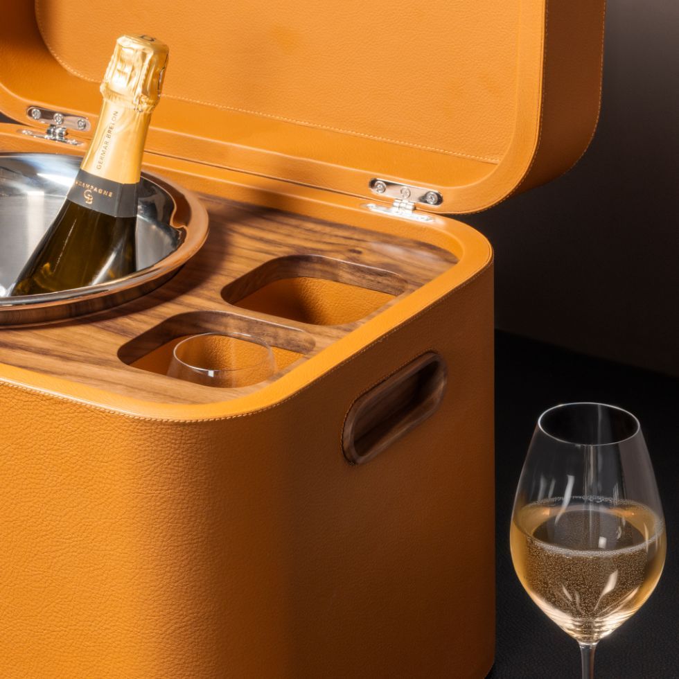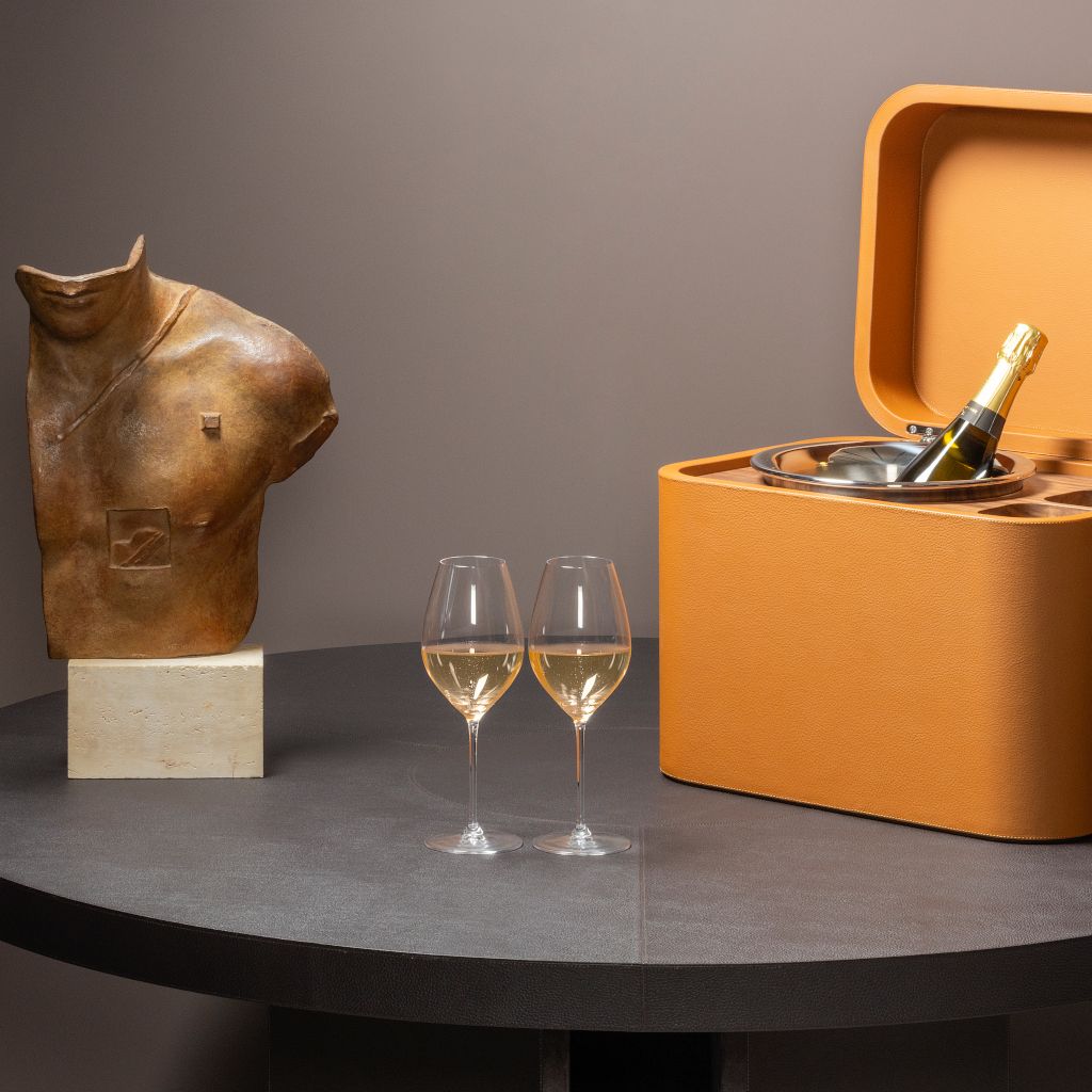 The set includes two master glasses and a champagne bucket with an insulated doublechamber polished steel structure and rich leather detailing.