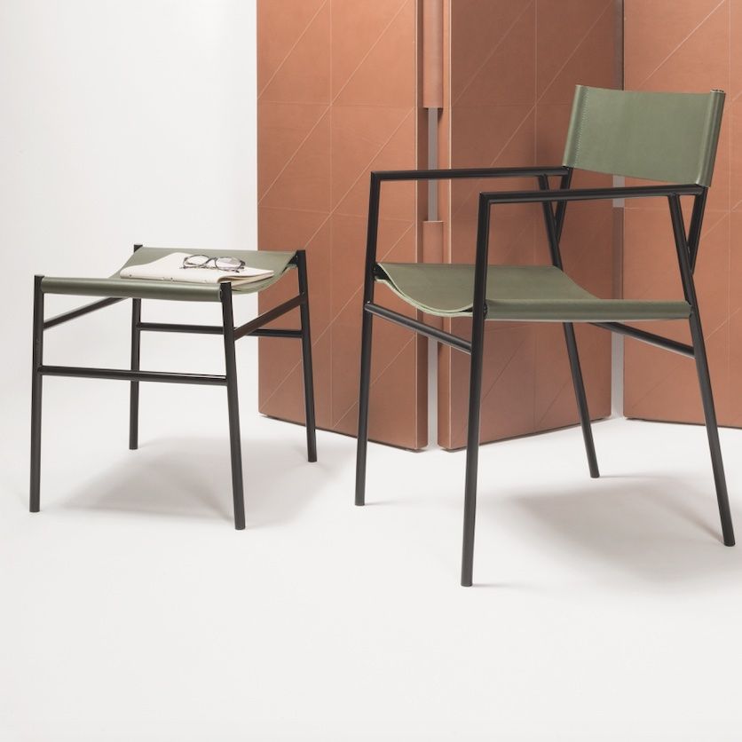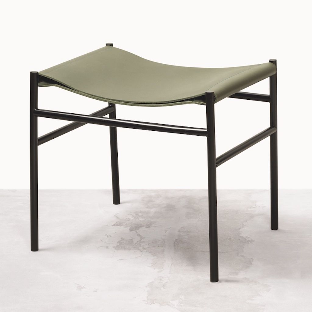 Two folded sheets of saddle leather are affixed to the pouf's metal frame in a design that perfectly adapts to the sitter's body to ensure comfort.