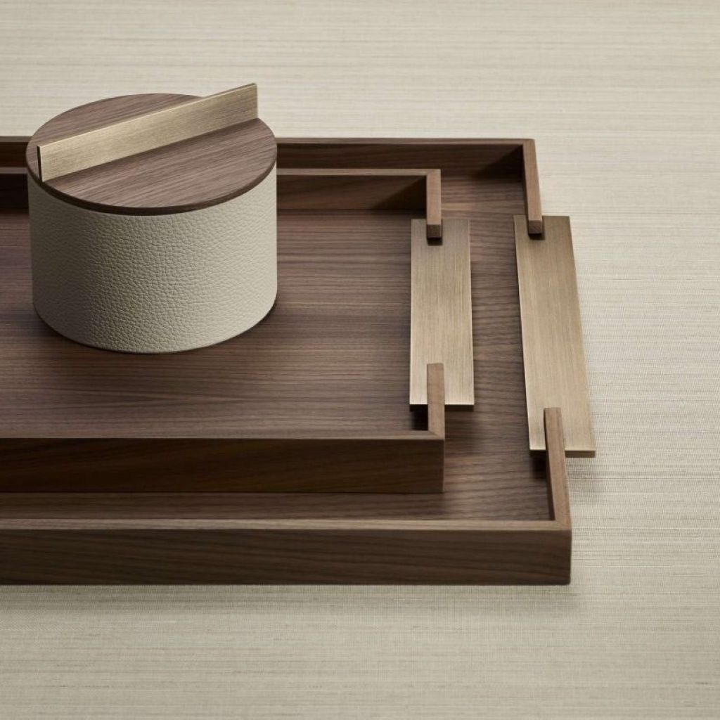 Partially leather-covered wood structure available in two finishes with brushed metal handle.
