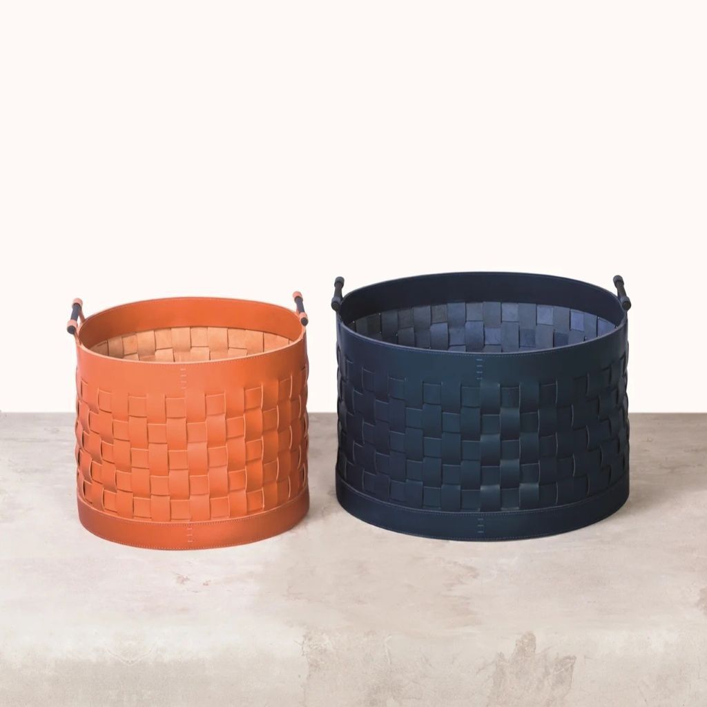 Braided water resistant saddle leather storage basket with brushed bronze handles.