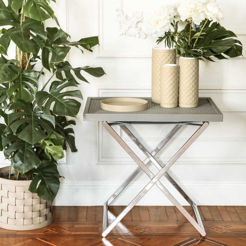 Side table with handwoven leather top. Chrome or gold metal legs with adjustable height.