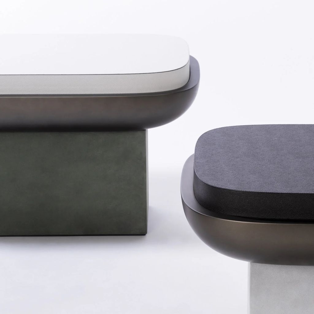 An extended collection of side tables and seats that mix hard and smooth materials such as suede, leather and bronze lacquered wood.