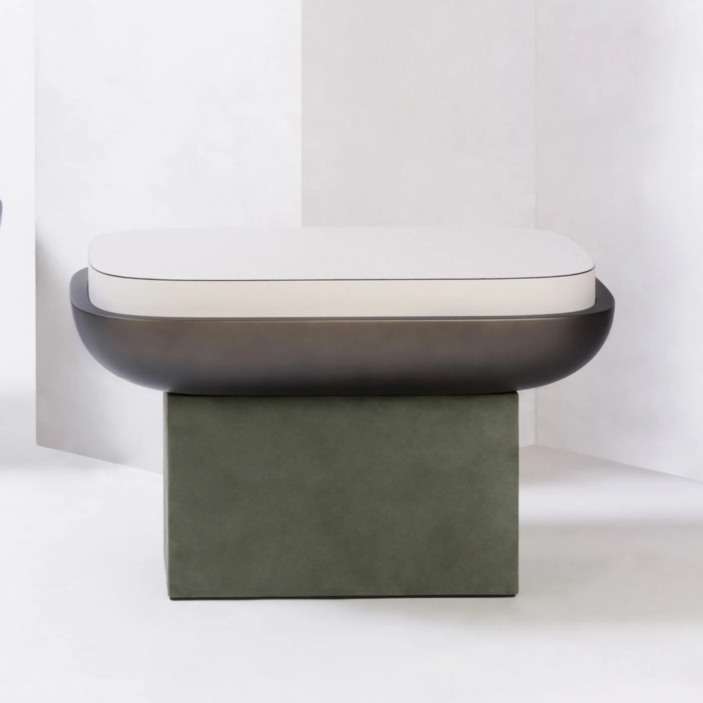 An extended collection of side tables and seats that mix hard and smooth materials such as suede, leather and bronze lacquered wood.