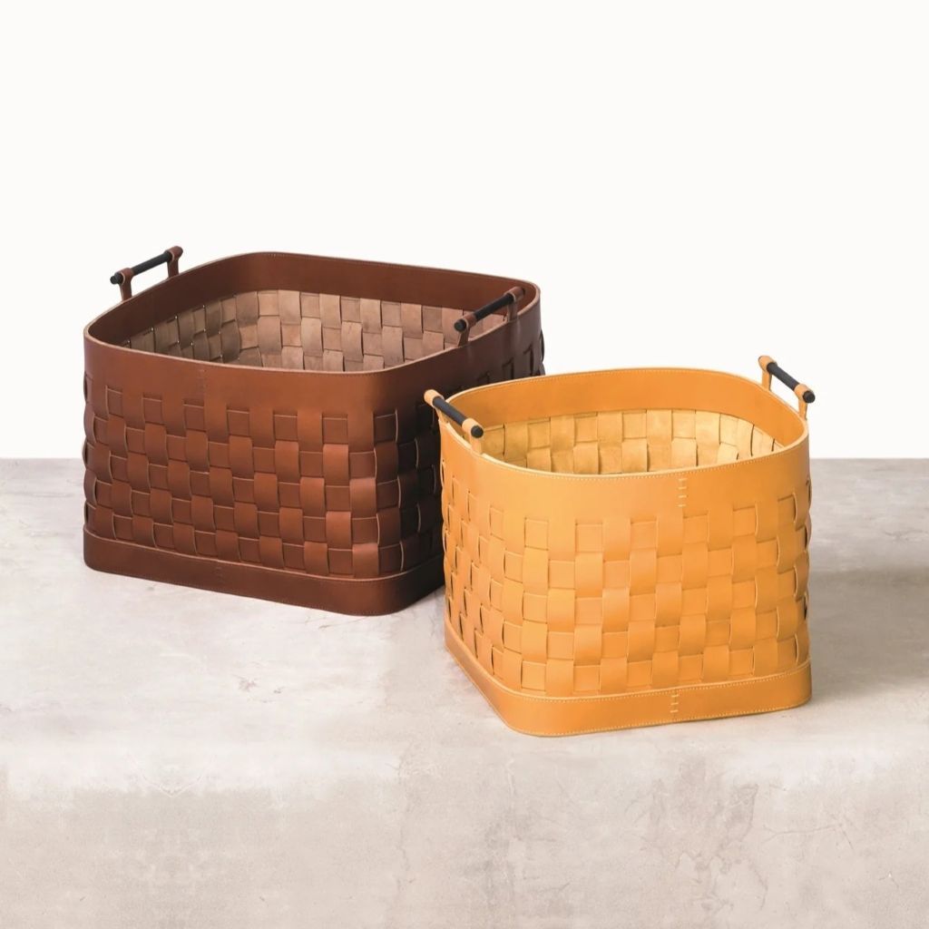 Braided water resistand saddle leather storage basket with brushed bronze handles.