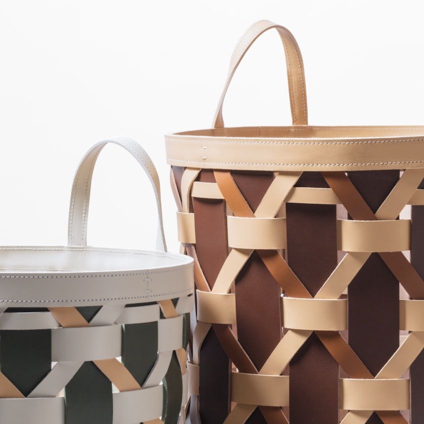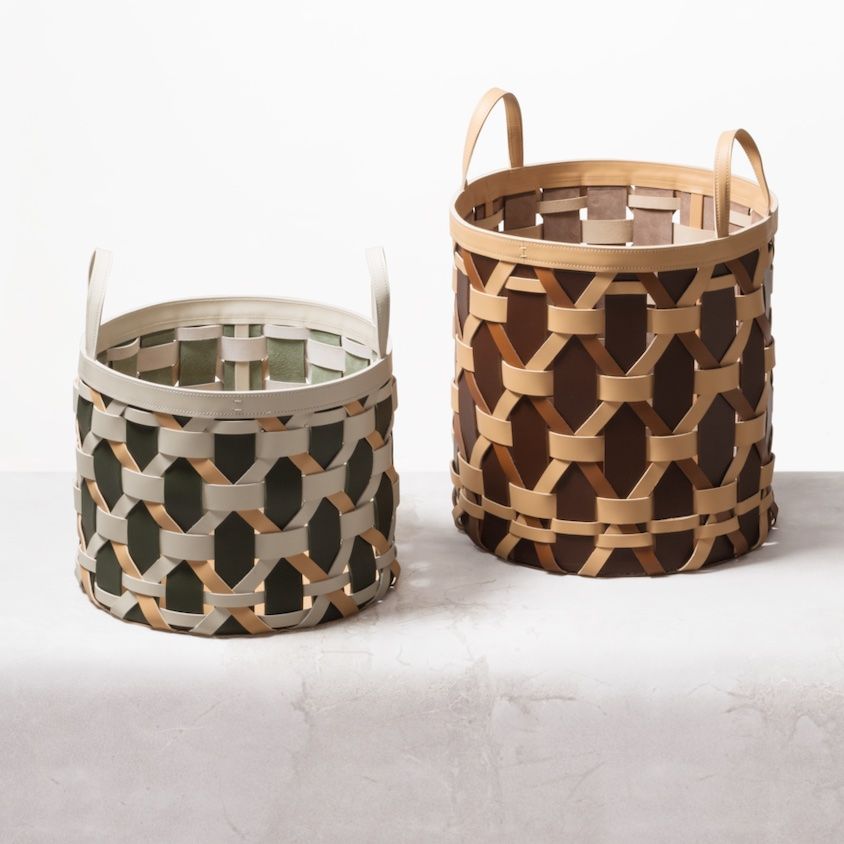 Braided multicolor saddle leather storage basket with handles.