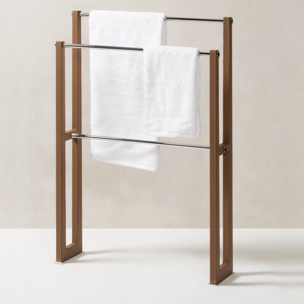Leather-covered wood structure covered with metal inserts available in different finishes.
