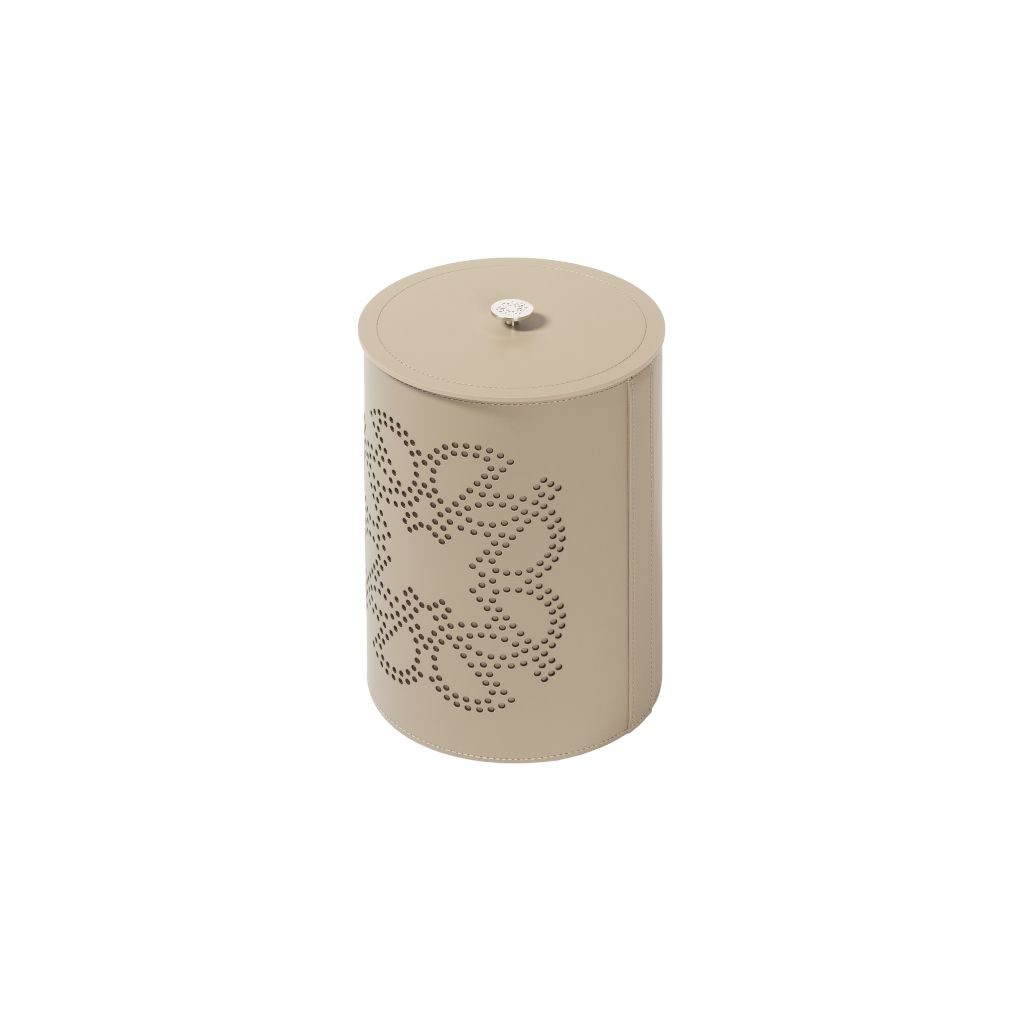 Finest regenerated reinforced leather structure with water-resistant and UV-resistant finish, featuring a perforated ELIE SAAB Monogram on two sides, palladium details and a removable transparent acrylic inner container.