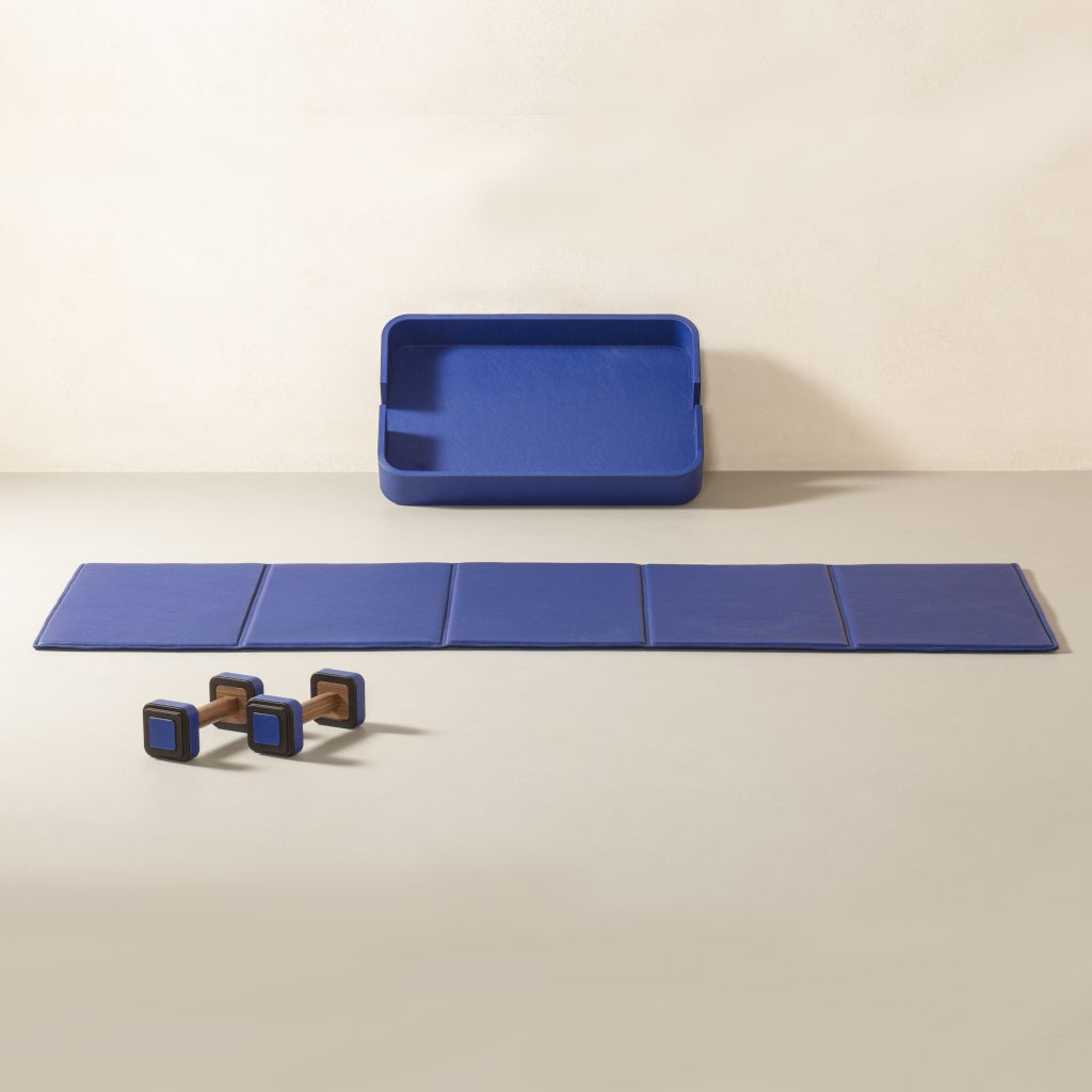 The soft mat is entirely covered in precious Pelle Frau leather. Ideal for home workout, it is foldable to be comfortably packed inside a matching leather-covered holder.
