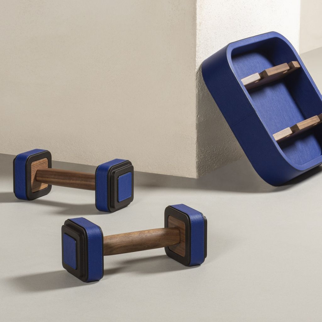 This pair of 2kg weights is designed to be both used for exercises and, when placed in its matching leather-covered holder with !ne walnut wood inserts, as a home decor, being a stylish product that can be proudly showcased inside homes.